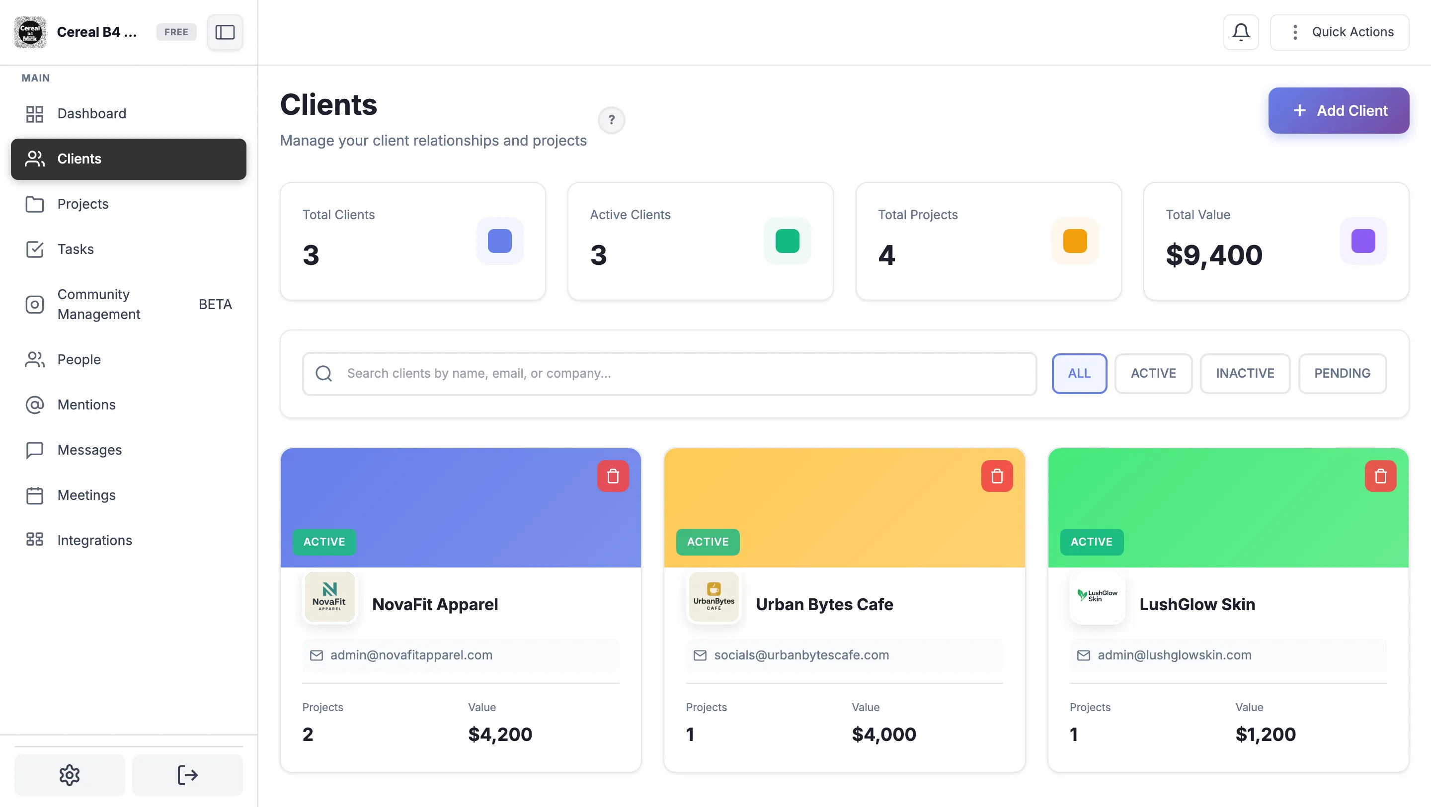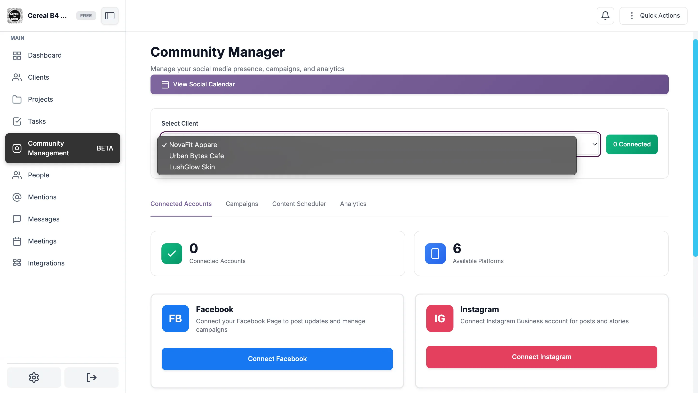 Visual task and content calendar. Drag-and-drop scheduling. In-app meeting scheduling. Google Calendar sync. Multi-platform content scheduler (FB, IG, TikTok, LinkedIn, YouTube, X, Threads).
