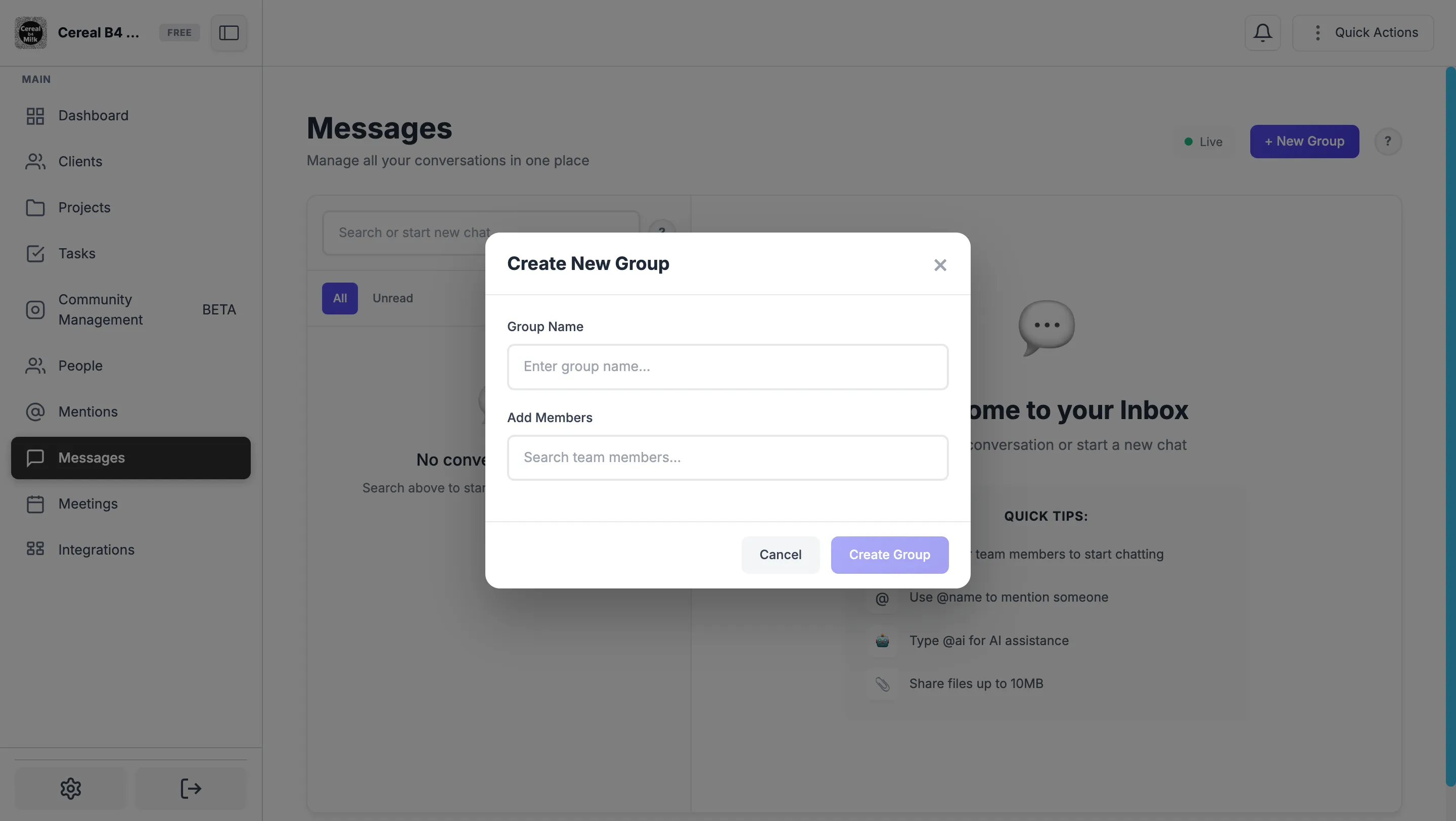 Brand, project, and task-level chats. Role-based channels (Admins, Creatives, Clients). @Mentions, threaded comments, and notifications. Track your daily mentions and tasks in one place. File sharing in messages.