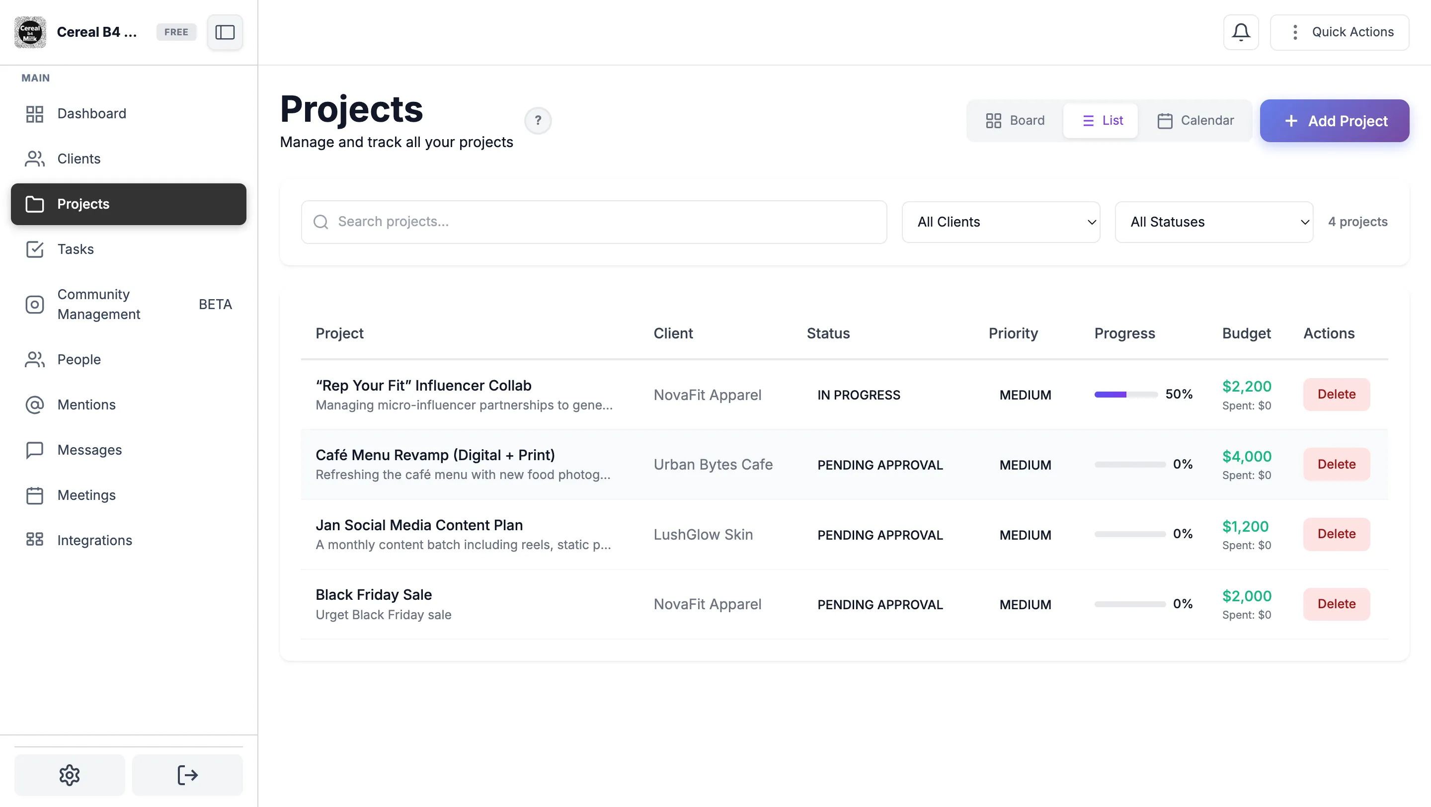 Project creation, stages, and dependencies. Tasks & subtasks with deadlines and priorities. Budget tracker & project progress bars. AI-generated tasks from briefs.