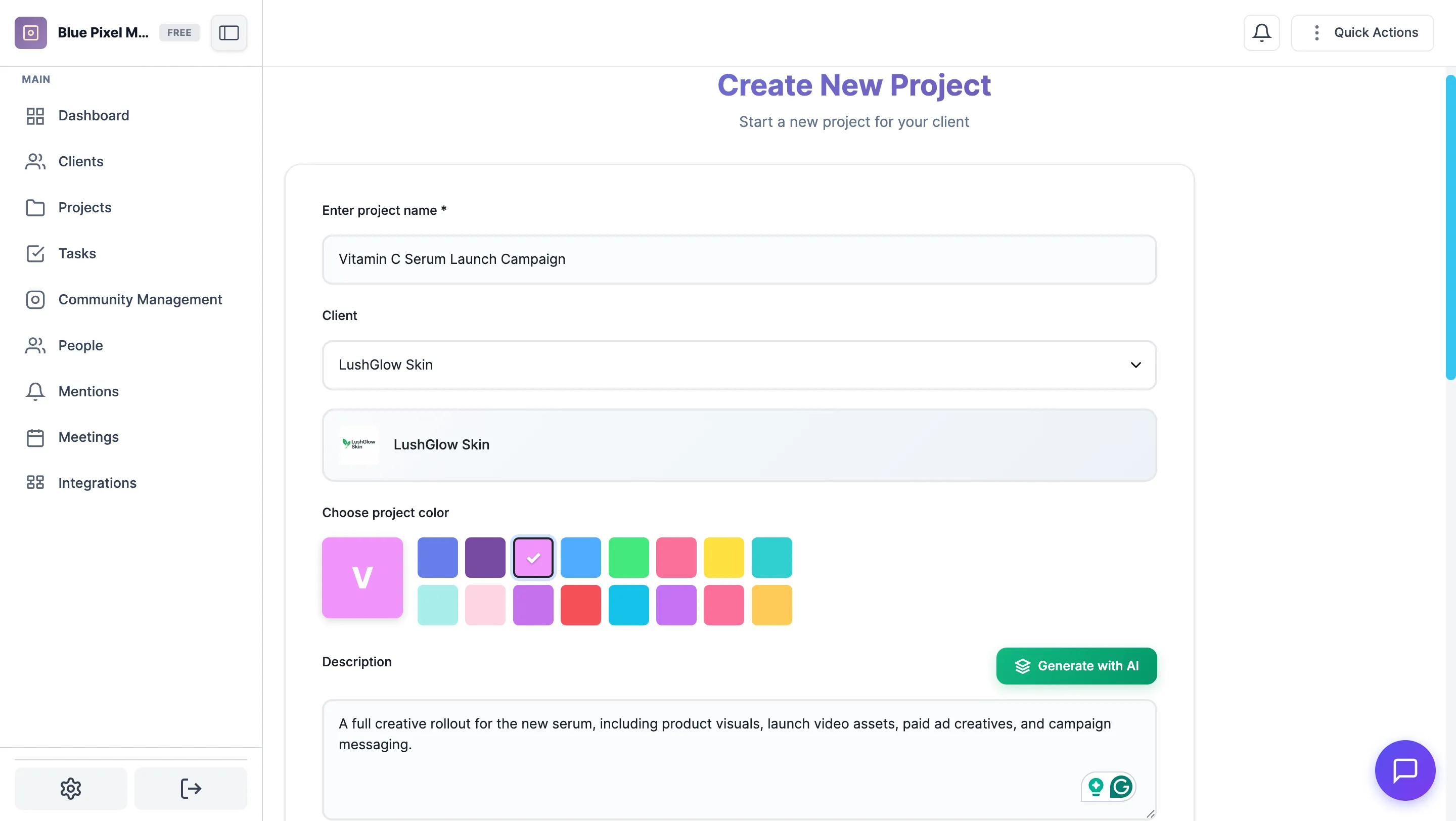 In-built AI to support agency workflow. AI-generated tasks, briefs, and project insights. Predictive workload suggestions. Risk flags and workflow recommendations.