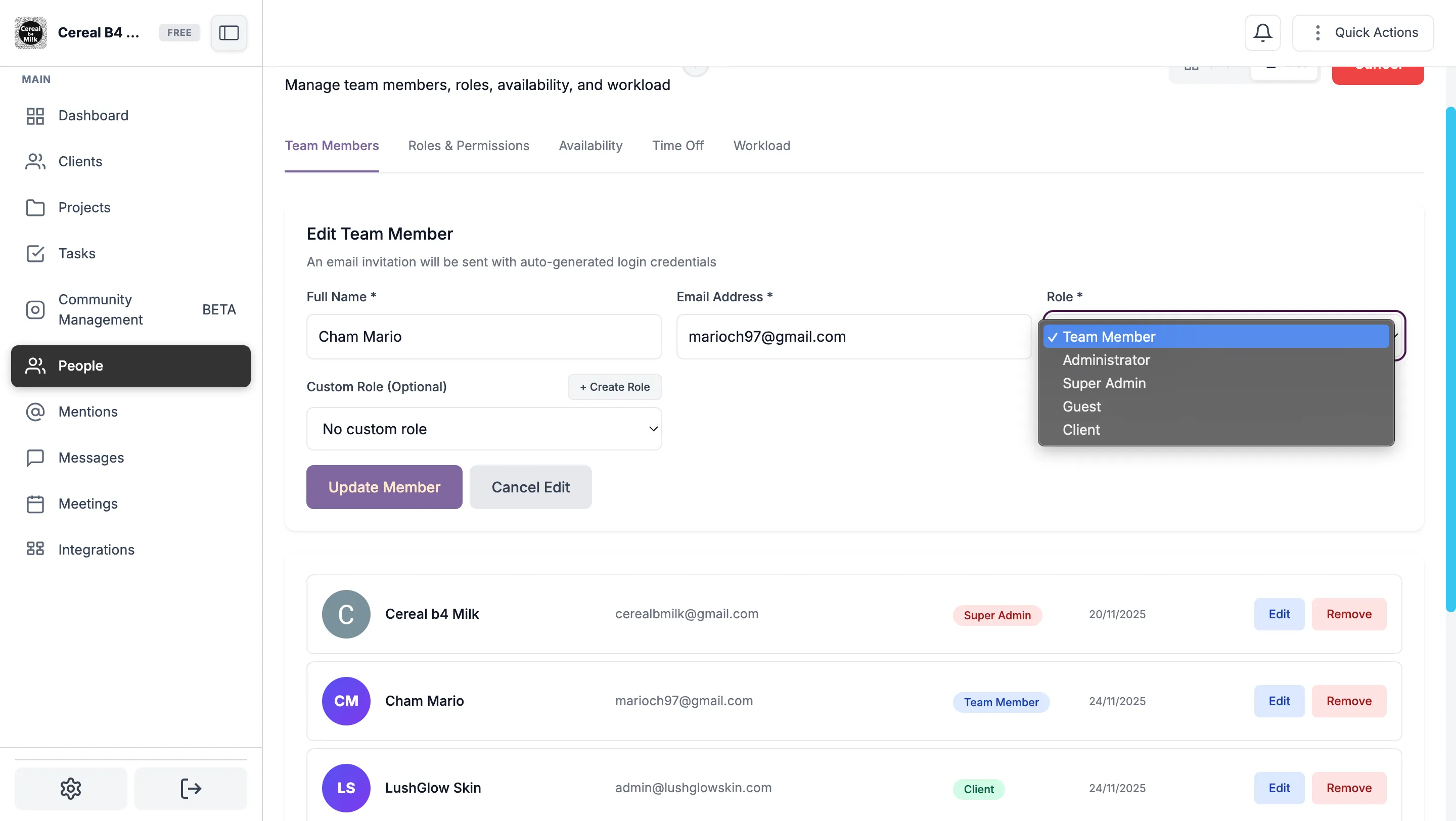 Super Admin / Admin / Team / Guest access. Custom permission levels and temporary guest links. Auto-expiring client access for security.